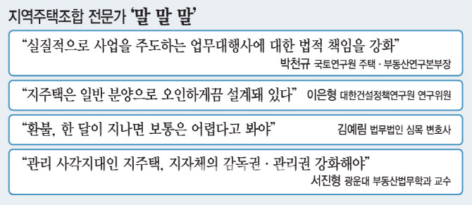 서진형 광운대 부동산법무학과 교수 겸 한국부동산경영학회 회장은 “지주택은 관리 사각지대에 있다 보니 조합의 전문성 부족과 조합 내 도덕성 문제가 발생하고 있다”며 “구청 등 지방자치단체의 관리 감독을 강화해야 한다”고 밝혔다. 이어 “토지 확보, 공사비 등에 있어서도 지자체의 감독권, 관리권을 강화할 필요가 있다”고 덧붙였다.