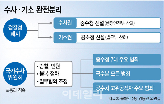 이를 위해 민주당은 기존 검찰청을 폐지한 뒤 공소청을 신설해 기소 및 공소유지 기능을 맡게 하고 기존 검찰의 수사권을 담당하도록 하는 중대범죄수사청(중수청)을 신설해 수사권을 이전하는 법안을 발의한 상태다. 공소청과 중수청은 각각 법무부와 행정안전부 산하에 두도록 할 계획이다. 여기에 국무총리실 산하에 국가수사위원회(국수위)를 신설해 중수청, 고위공직자범죄수사처(공수처), 경찰 국가수사본부(국수본) 등의 업무를 관리·감독해 권력 집중을 방지하겠다는 복안이다.