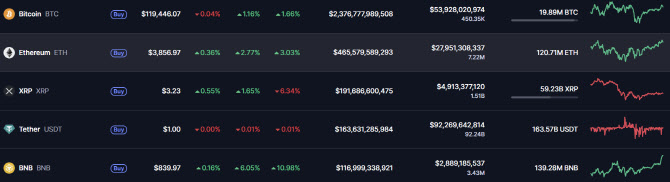 28일 글로벌 가상자산 시황중계 사이트 코인마켓캡에 따르면 이날 오전 8시 5분 기준 비트코인 가격은 24시간 전 대비 1.16% 오른 11만 9446달러를 기록했다. 일주일 전과 비교하면 1.66% 올랐다. 알트코인(비트코인 외 가상자산)의 대표격인 이더리움은 전일 대비 2.77% 오른 3856달러에 거래됐다.