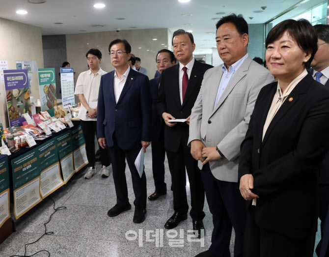 [이데일리 김태형 기자] 송미령(오른쪽부터) 농식품부 장관, 어기구 국회 농해수위원장 홍문표 한국농수산식품유통공사 사장, 이만희 의원 등이 23일 국회 의원회관에서 열린 ‘대한민국 식품산업 발전방안 국회 토론회’에 참석해 전시부스를 순람하고 있다.