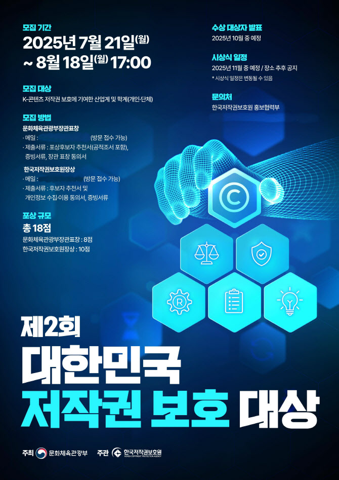 올해는 저작권 보호를 통해 K-콘텐츠 산업 발전에 기여한 공로자 18명을 선정해 8명에게는 문체부 장관 표창, 10명에게는 저작권보호원장상을 수여한다.