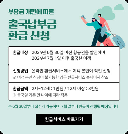 정부는 최근 ‘관광진흥개발기금법 시행령’ 개정을 통해 2024년 7월 1일부터 출국납부금을 기존 1만 원에서 7000원으로 인하하고, 면제 대상도 확대했다. 이에 따라 문화체육관광부로부터 환급 업무를 위탁받은 인천국제공항공사가 환급 절차를 진행 중이다.