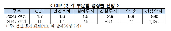 민간 소비는 전년 동기 대비 1.6% 증가할 것으로 예상된다. 실질임금 개선 속도가 완만하고 생활물가·주거비 부담이 높아 회복 폭이 제한될 전망이다. 설비투자는 반도체 등 첨단 분야의 개선에 힘입어 같은 기간 1.5% 회복할 것으로 점쳐진다.