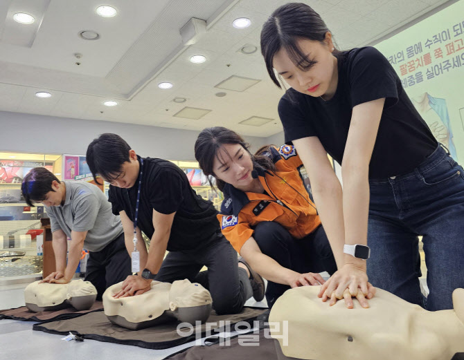 서초구 KCC 사옥에서 전문 소방대원과 의용소방대원들의 지도 하에 실시한 응급처치 교육은 △심폐소생술(CPR) △자동심장충격기(AED) 사용법 △하임리히법(기도 폐쇄 응급처치법) 등 실생활에서 마주할 수 있는 응급 상황과 그에 맞는 처치 이론 및 실습으로 진행한다