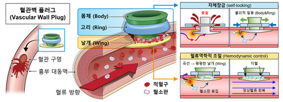 연구팀은 혈관 외부에서 구멍을 물리적으로 막을 수 있는 동시에 내부에서는 혈류를 조절해 지혈을 촉진하는 ‘혈관벽플러그(vascular wall plug, VWP)’를 개발했다.