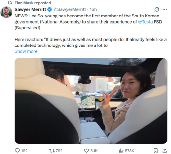 해당 포스트는 유명 인플루언서로 테슬라 투자자이기도 한 소여 메릿이 리포스트하면서 온라인 상에서 빠르게 퍼졌다. 메릿은 “이소영 의원이 한국 국회에서 처음으로 FSD 체험을 공유한 이가 됐다”며 이 의원의 체험 소감도 소개했다. 여기에 머스크도 메릿의 글을 공유하면서 해당 포스트는 50만회 이상 읽혔다. 이 의원은 18일 메릿에게 “포스트를 공유해줘서 고맙다”는 메시지를 올리기도 했다.